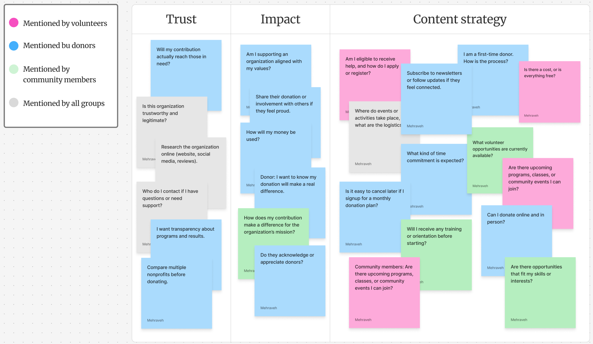For all users specially donors and volunteers, understanding the organization’s impact was critical. Users wanted to feel that their contributions, whether time, resources, or money, were meaningful and effective. Emotional connection, recognition, and visibility of outcomes were key drivers. Users cared about the nonprofit’s values and trajectory, and they wanted reassurance that their engagement contributes to a larger purpose. Donors want to stay connected to the organization and be a part of impact.