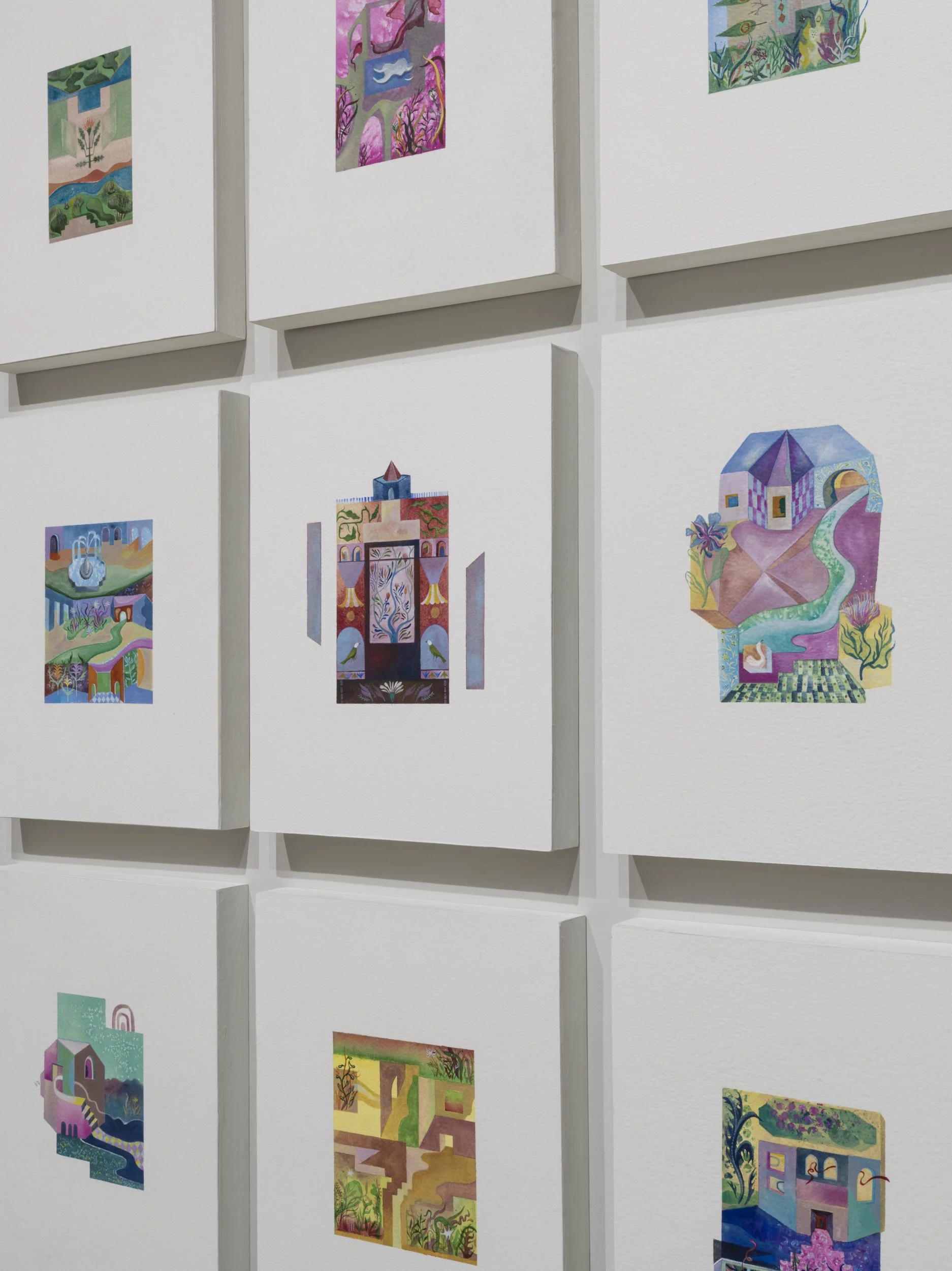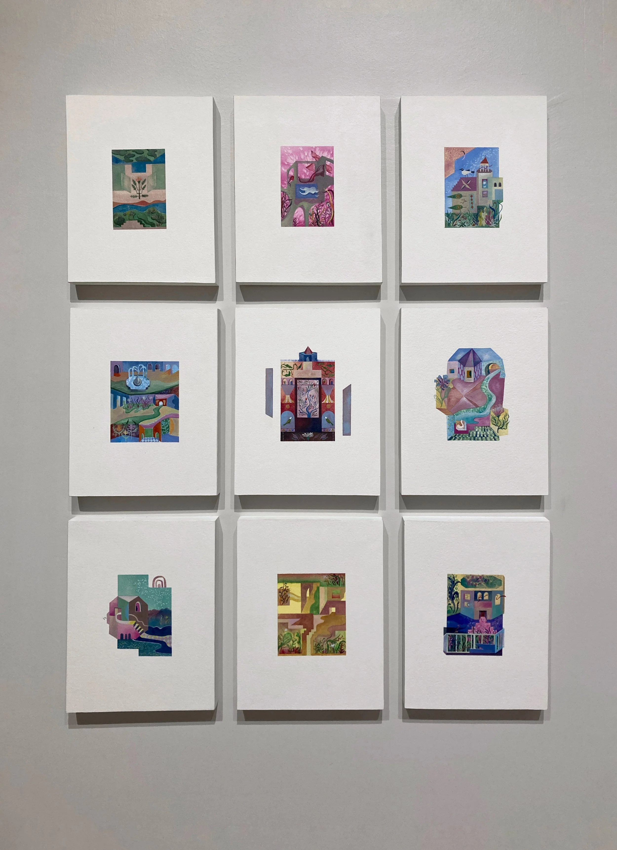 The first series, Imagined, consists of nine small watercolor pieces that draw inspiration from traditional Persian miniature paintings to create an idealized, almost mythical version of home. These small-scale pieces invite the viewer into an intimate world, like a story filled with warmth, hope, and gentle nostalgia. There are no shadows in these paintings, a deliberate choice to suggest a utopia where nothing is hidden and everything is in clarity and light. This series presents a perspective on home driven by imagination and the wish for a place unchanged by time or hardship.